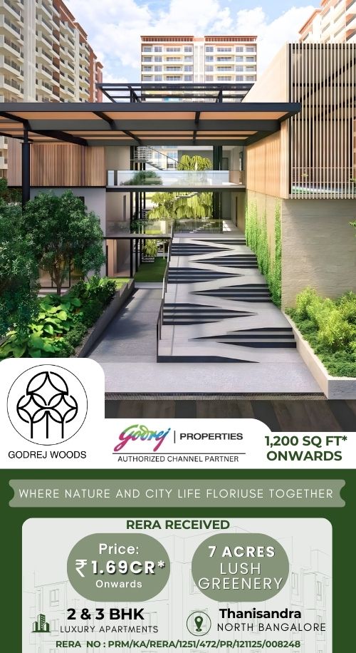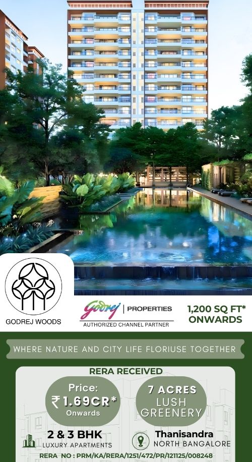 About Godre Woods Godrej Woods Thanisandra will be constructed on 7 Acres of land parcel, 10 Towers with 2 Basement + Ground + 13 Floor floors having 2 BHK and 3 BHK premium residences. Godrej New Launch Thanisandra Project is located On Thanisandra Main Road, North Bangalore with - Upcoming Metro Stn-3min, Bhartiya Mall- 4min, Manyata Tech Park- 15min and International Airport- 10min. Godrej Properties Thanisandra Project first is internal amenities - Vitrified tles, Granite Kitchen, Branded fitting, Metal Door, Stainless steel sink, CP fitting & many more. Godrej Thanisandra External Amenities Project has 40+ luxurious amenities with likes of - Swimming pool, Gymnasium, Senior Citizen Area, Kid's Play Area, Multipurpose Hall, Indoor games & Many More. Godrej New Launch in Bangalore Project has two type of car parking facility - Basement & Ground. Godrej Thanisandra Bangalore Possession - Rera Possession - December 2029 and Target Possession - December 2029. Carpet Area & Floor Plan Godrej Thanisandra Main Road of project has 2BHK & 3BHK premium residences with - 2BHK - (1190 - 1240) sqft and 3BHK - (1880 to 2300) sqft. Godrej Thanisandra New Project Prices & its details can be found in the price section & Godrej Properties New Launch Bangalore brochure can be downloaded from the link mentioned below. Project has been praised by the home buyers & Godrej Properties Thanisandra review is 4 out of 5 from over all the clients who have visited the site.